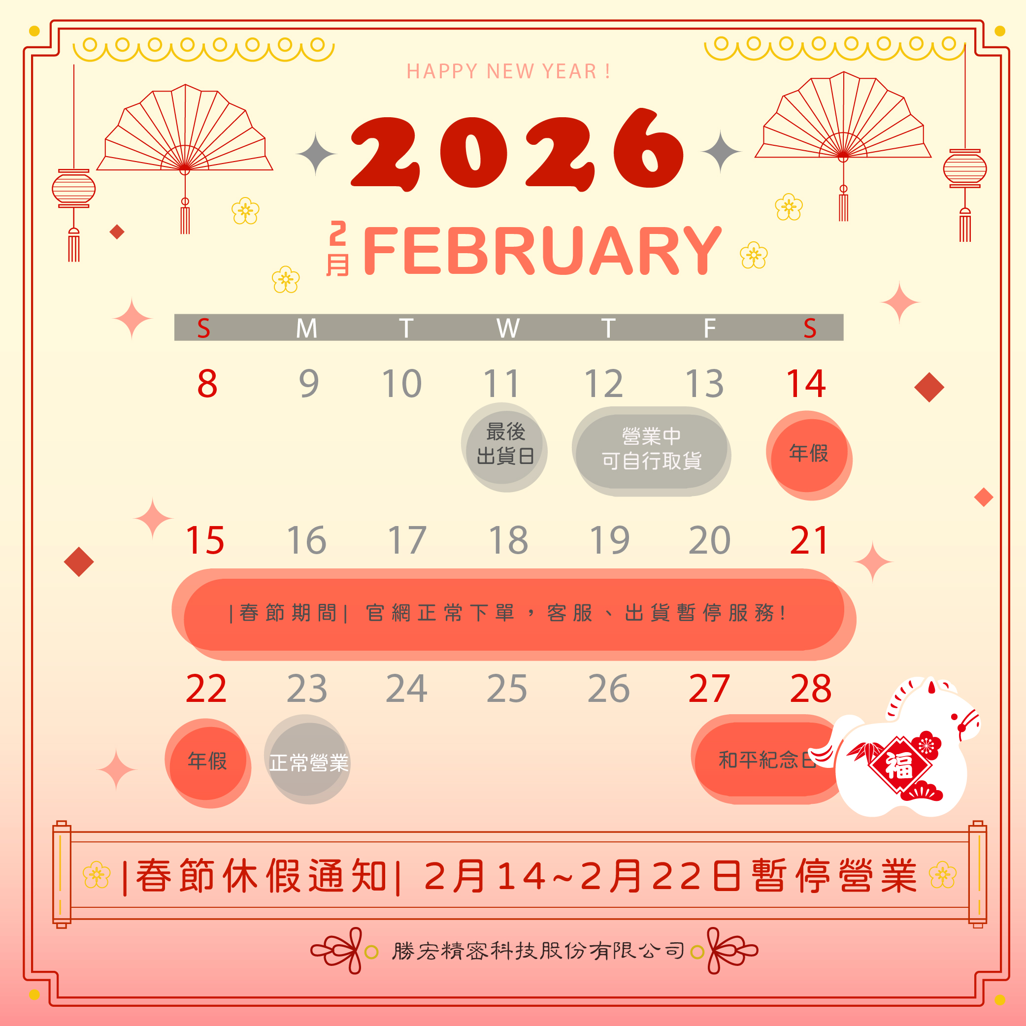 📢【勝宏精密科技|2026 春節休假公告】